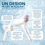 Functii | Actiune eficienta pentru multiple nuante de piele si par, Afisaj digital, Design compact, Pulsare automata, Pulsare manuala, Tehnologie IPL |